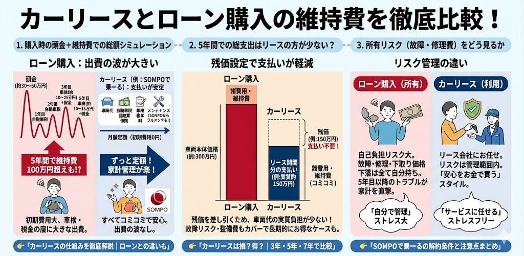 👉 「カーリースとローンの違いを簡単解説」では、購入よりリースの方がトータルコストを抑えられる理由を紹介しています。