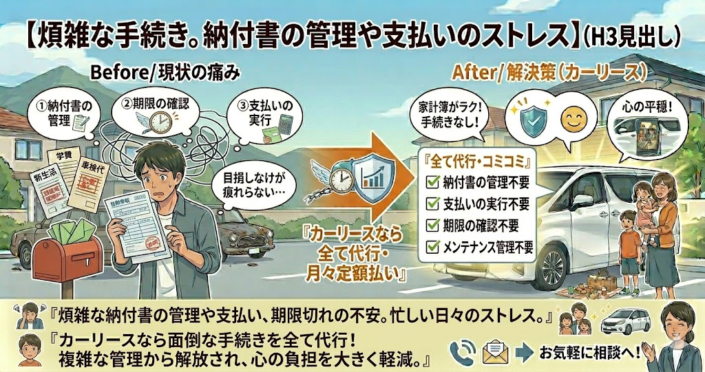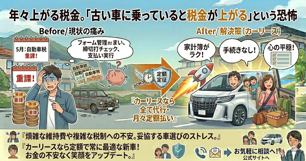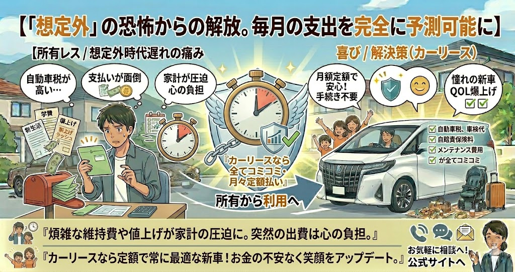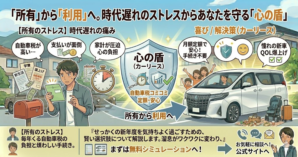 本記事では、毎年やってくる自動車税の悩みから解放され、お金の不安なく、あなたと家族の笑顔をアップデートする「新しい車の持ち方」について、具体的に解説します。