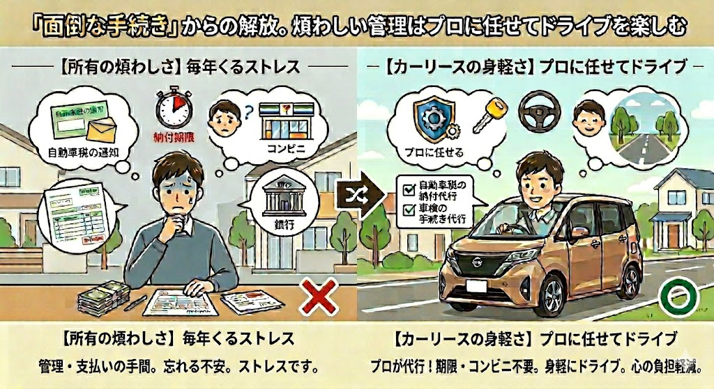 「車は欲しいけれど、自動車税の支払いや車検、定期的なメンテナンスの管理がやっぱり面倒」