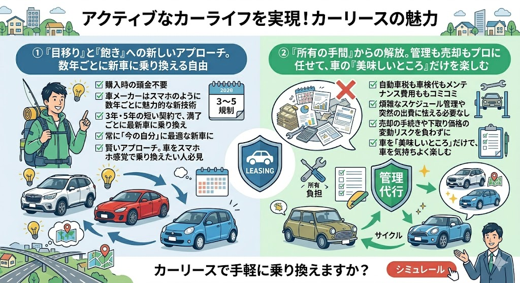 そう感じるアクティブな人も多いはずです。また、数年後に車を売却する際の手続きや、下取り価格の変動リスクを気にするのも、心の負担になります。