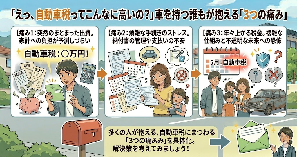 多くの人が抱える、自動車税にまつわる「3つの痛み」を具体化し、解決策を考えてみましょう。