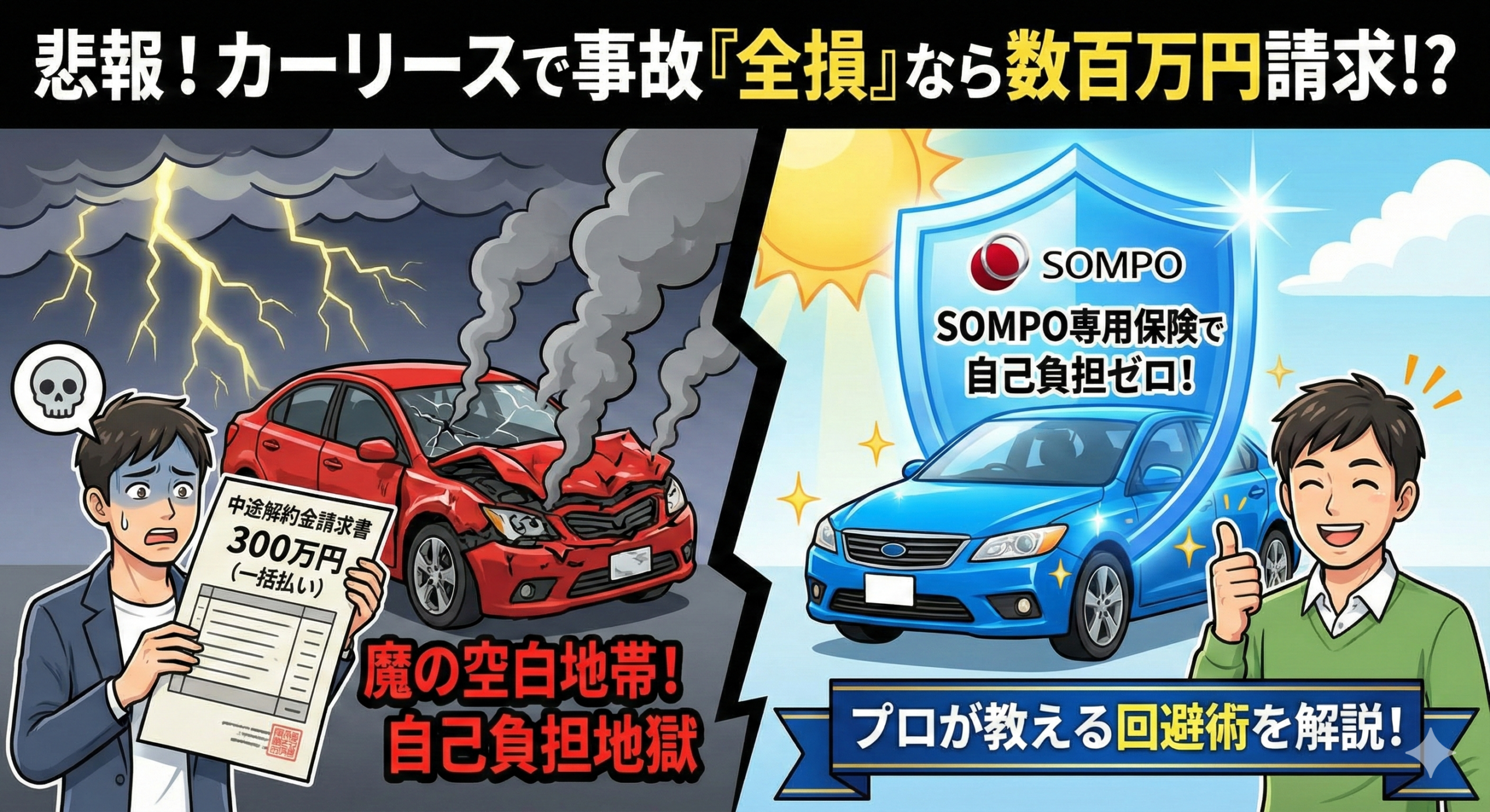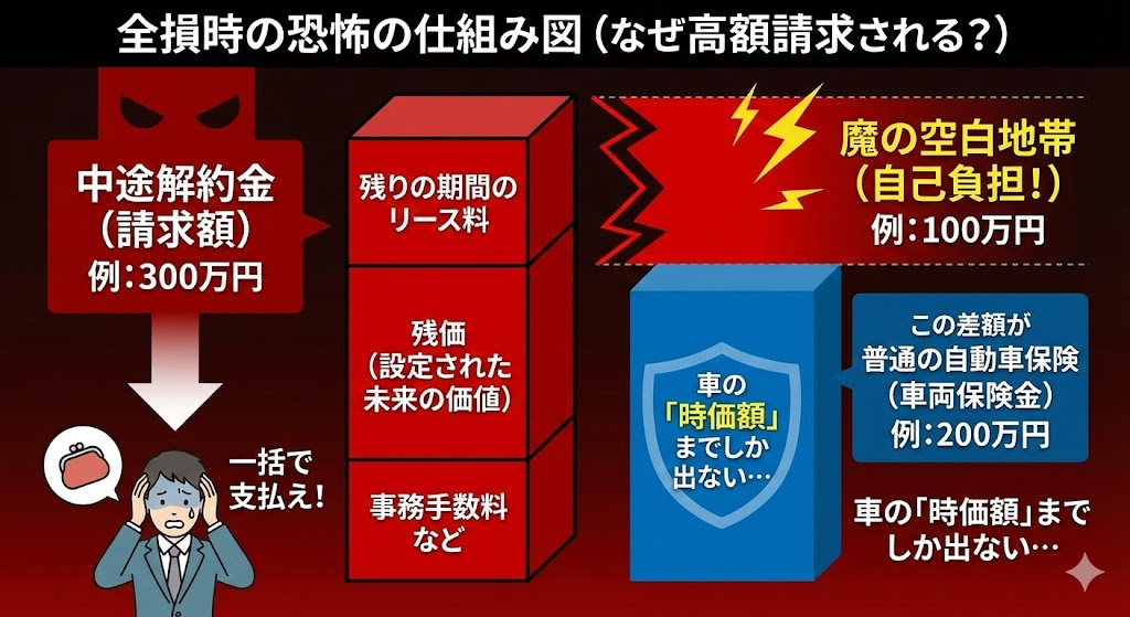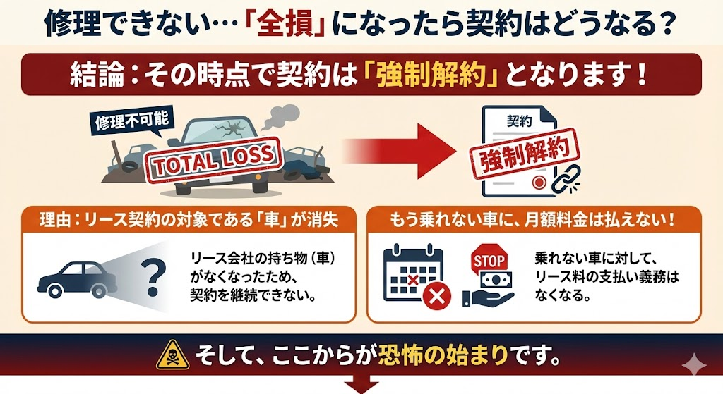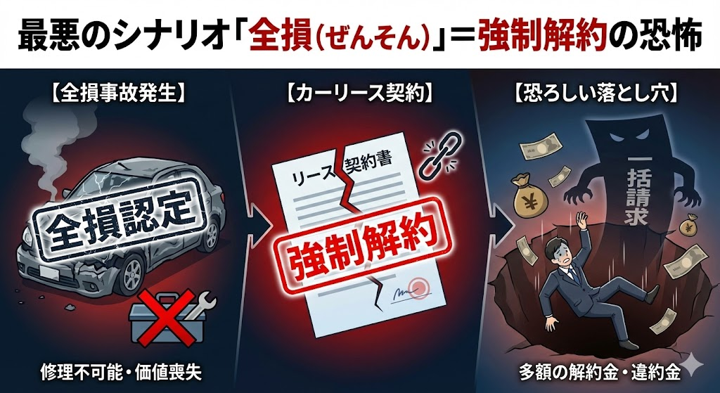 事故で車が「全損(修理不可能)」になると、その時点で強制解約となり、数百万円単位の莫大な違約金が一括請求される可能性があるんです。