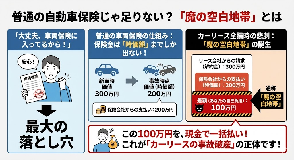 普通の車両保険では「魔の空白地帯(自己負担額)」が発生するリスクがあります!