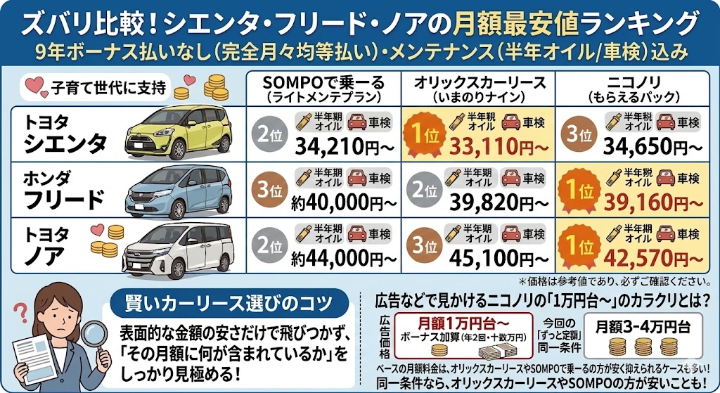 ズバリ比較!シエンタ・フリード・ノアの月額最安値ランキング