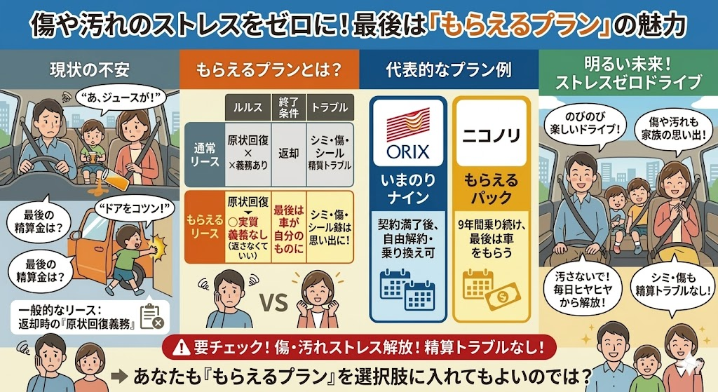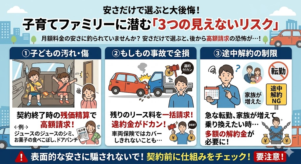 「子どもが車内を汚したり、傷をつけたりしたら、最後に高額な違約金(残価精算)をとられるって聞いて怖い…」