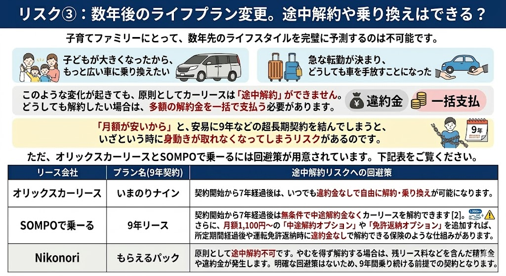 リスク③:数年後のライフプラン変更。途中解約や乗り換えはできる?