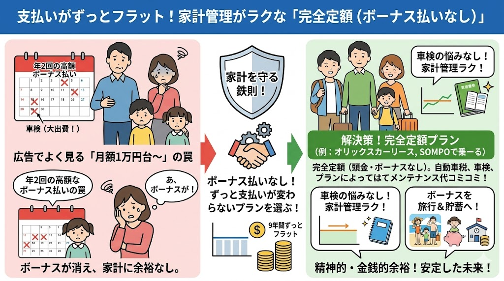 - オリックスカーリースやSOMPOで乗ーるなどは、頭金・ボーナス払いなしの「完全定額」プランが充実。