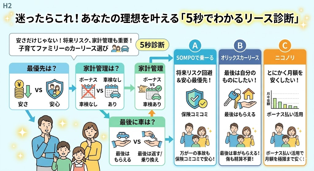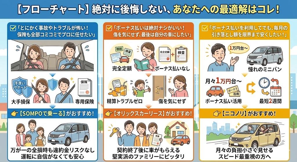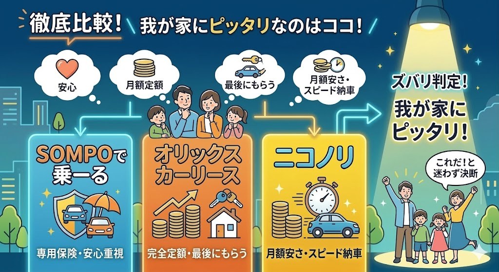 実は人気3社(SOMPOで乗ーる、オリックスカーリース、ニコノリ)は強みが全く異なり、ご家族が「何を最優先するか」で正解が変わります!