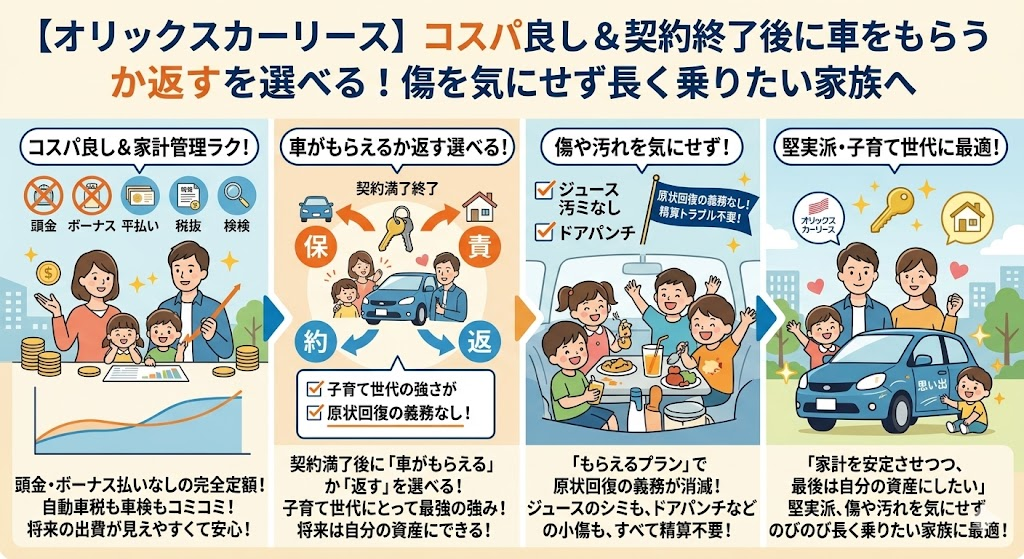 【オリックスカーリース】コスパ良し&契約終了後に車をもらうか返すを選べるもらえる!傷を気にせず長く乗りたい家族へ