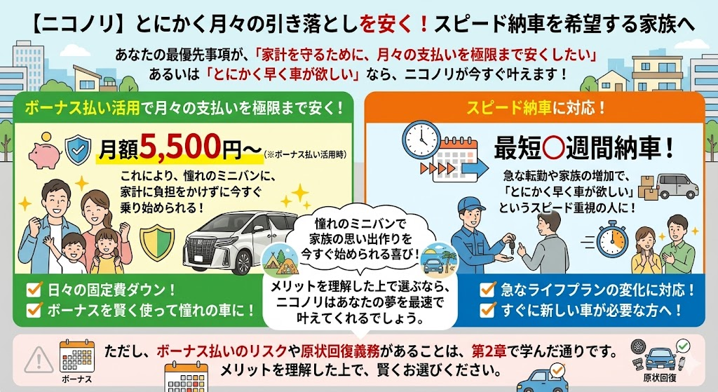 【ニコノリ】とにかく月々の引き落としを安く!スピード納車を希望する家族へ